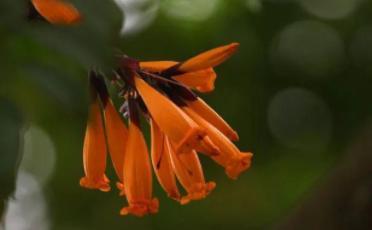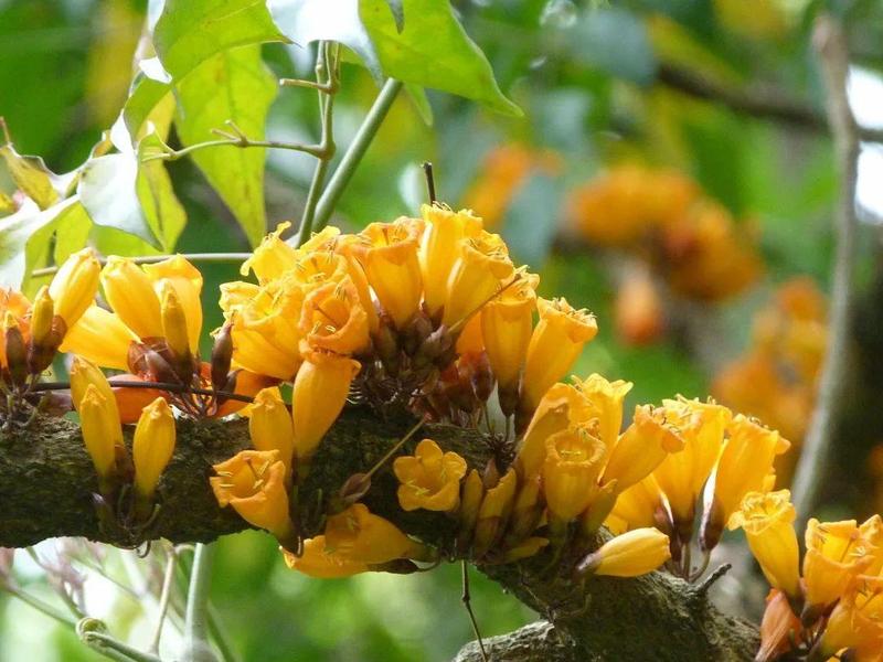 穗状花序,生于老枝上;花冠钟状,金黄色或橙黄色,5裂,裂片半圆形。