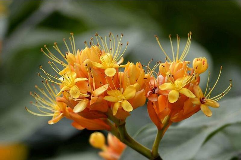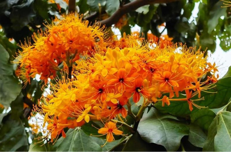 中国无忧花为常绿乔木,幼嫩叶紫红色。伞房状圆锥花序腋生,花橙黄色至深红色。