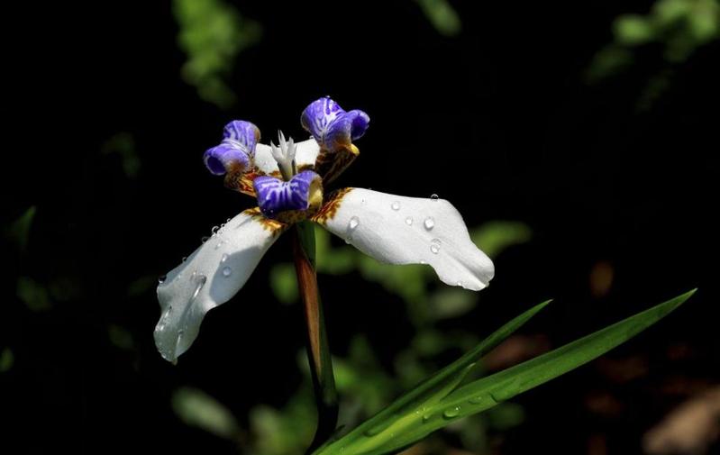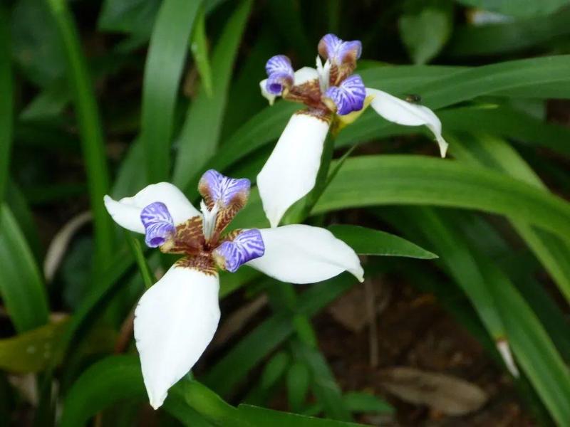 巴西鸢尾为多年生草本。叶条形,花从花茎顶端鞘状苞片内开出,花瓣6枚,3枚外翻的白色苞片基部有红褐色斑块;另3枚直立内卷,为蓝紫色并有白色线条。