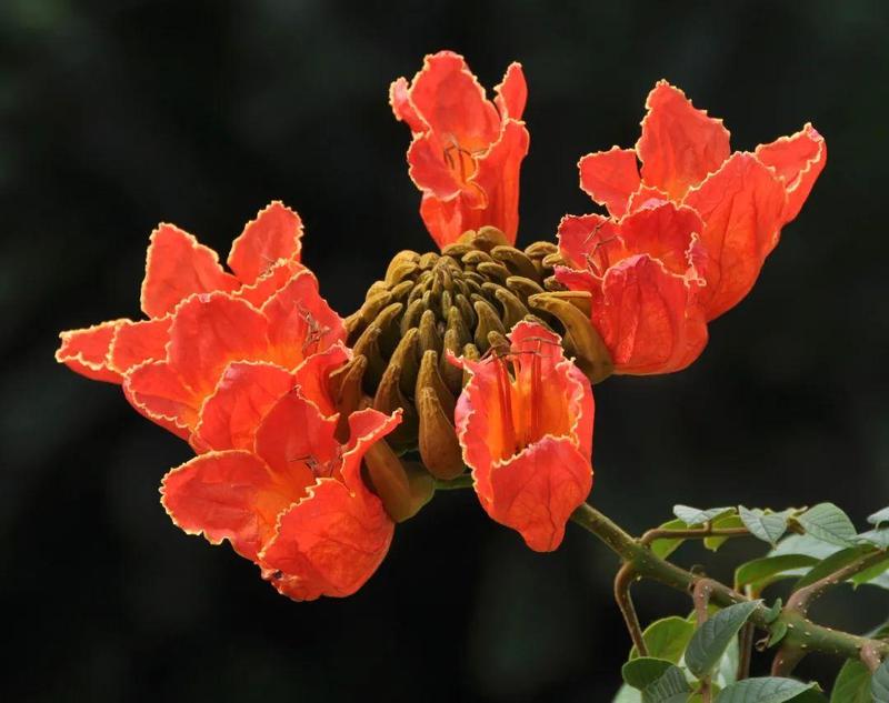 火焰木为常绿乔木。花大,花萼佛焰苞状,花冠橙红色,开花时,花朵自外围向中心逐渐开放。