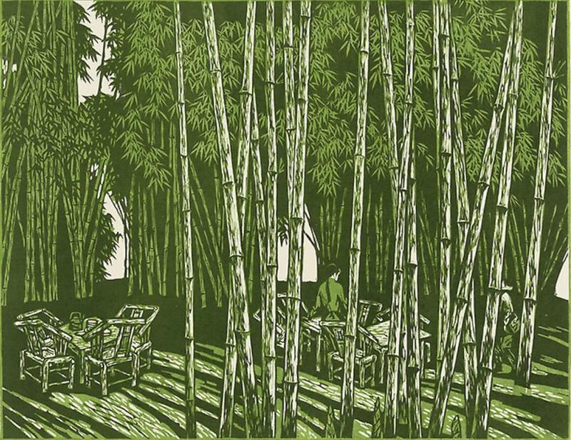 中国当代艺术家胡名的《竹林深处》。在这幅版画作品中,竹子郁郁葱葱的生长着,为夏日带来无尽的凉意。竹林间放置着三两竹桌竹椅,茶壶茶杯在桌上待人享用。“蝉噪林逾静,鸟鸣山更幽”,静处萌生律动,苍翠的竹林瞬间定格,氤氲的水汽缭绕,梦,停留在《竹林深处》。