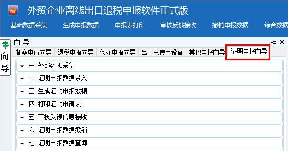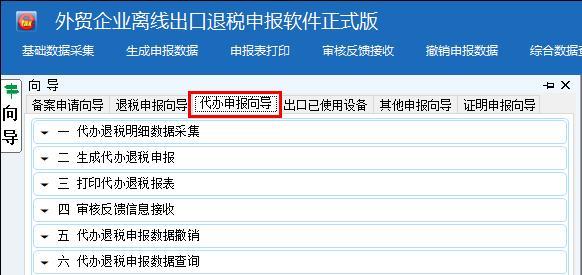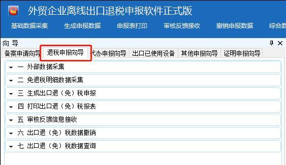 进入离线申报系统,选择“向导→退税申报向导”(见下图)后,按以下流程操作: