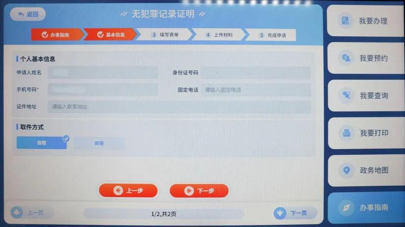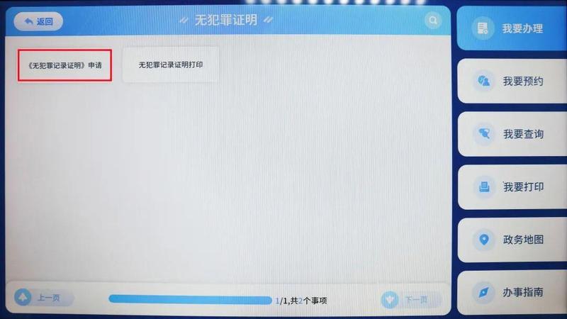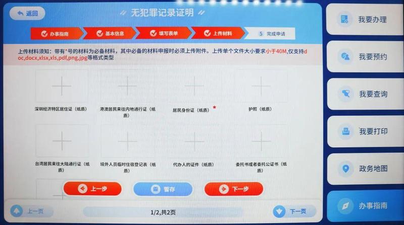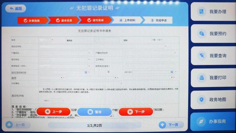 在自助终端上点击“公安”,选择“无犯罪证明”—“无犯罪记录证明申请”,根据户籍类型选择“办理情形”,使用“i深圳”App扫码登录,完成“填写表单”、“上传材料”等步骤,确认无误后点击提交。