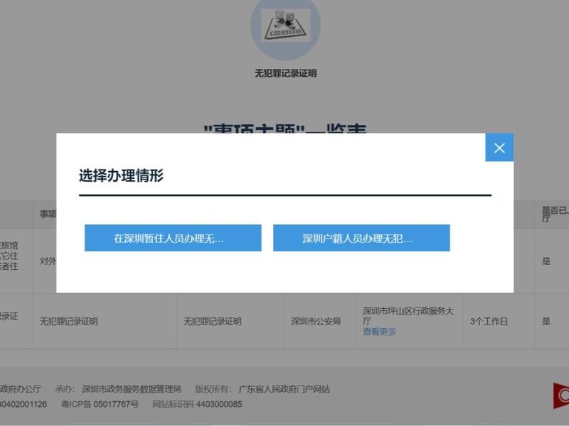 将行政部门切换为“深圳市—南山区”,搜索“无犯罪记录证明”,选择“办理情形”,完成填写表单、上传材料等步骤,确认无误后点击提交。