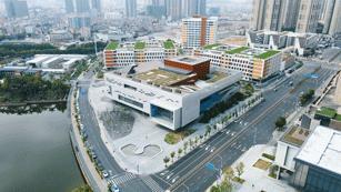 坪山文化聚落在坪山区的中心,由悬浮的美术馆、彩色的大剧院和宛如书卷的图书馆三部分组成。
