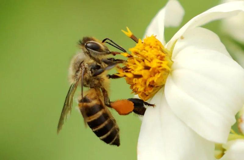 ▲ 嚼吸式口器。吸食白花鬼针草花蜜的西方蜜蜂。