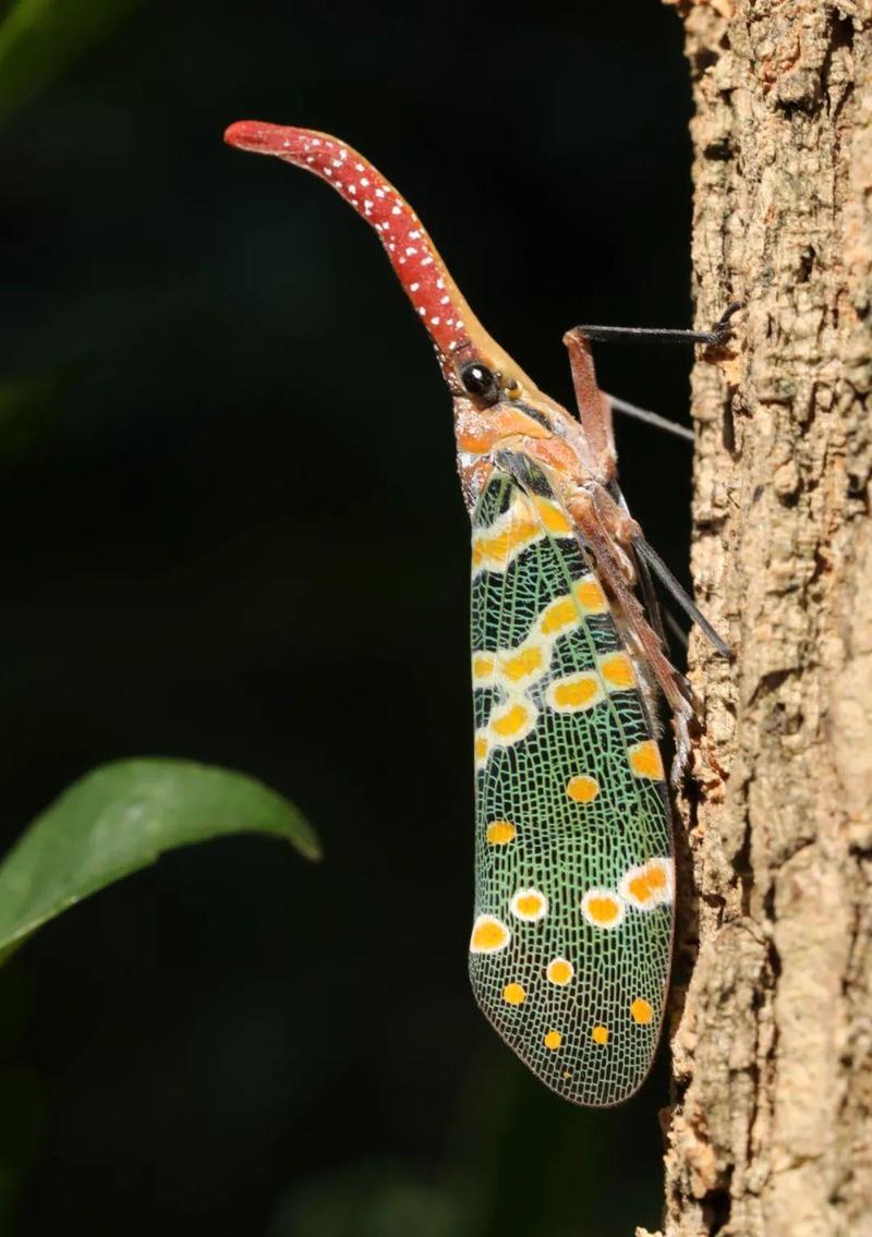 ▲ 龙眼树上的龙眼鸡。头上方的鲜红的长鼻状突起夺人眼球,上面零星的缀着白点。绿色的前翅上分布着鲜亮的柠檬黄色斑点,分外靓丽。