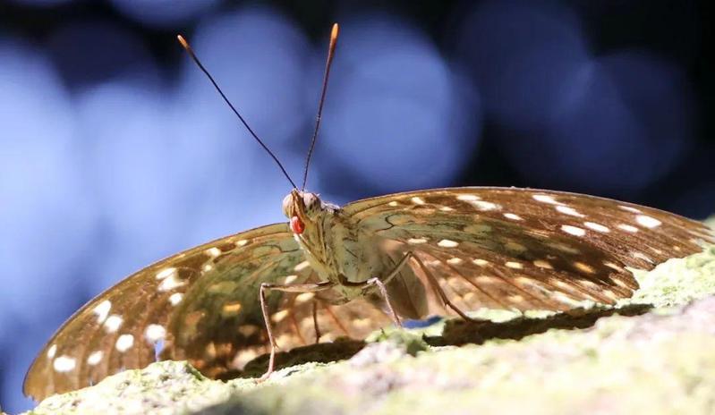 ▲ 小豹律蛱蝶的触角。蝴蝶的触角大多像一个小鼓槌,末端像一个逗号。蝴蝶的触角有发达的嗅觉和触觉,还有保持身体平衡的功能,也是找寻花朵的主要定位器。