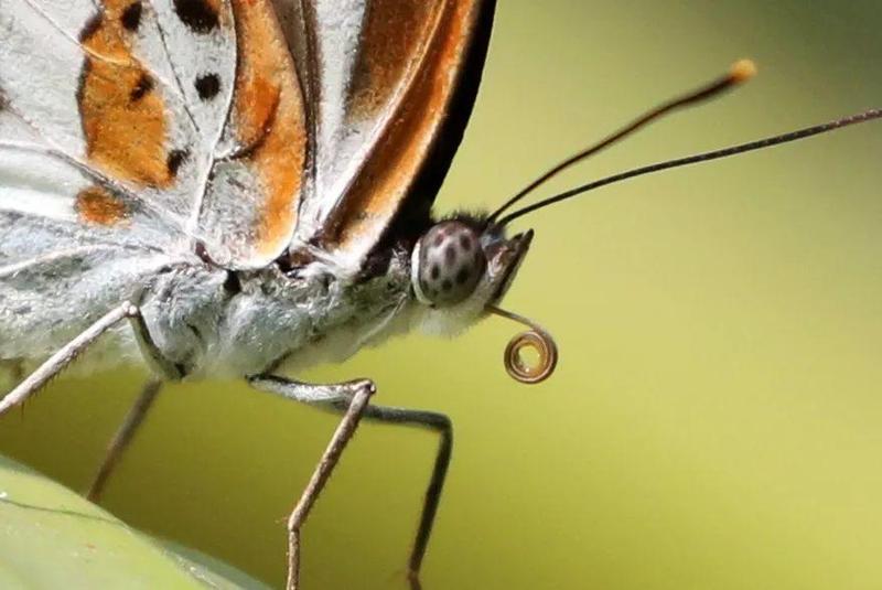 ▲ 虹吸式口器。残颚线蛱蝶收起来的“吸管状”口器。