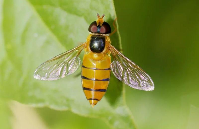 ▲ 狭口食蚜蝇,装扮成蜂的蝇。食蚜蝇把自己拟态为凶狠有刺的胡蜂和蜜蜂。为了逼真,还会仿效蜂做螫刺动作。