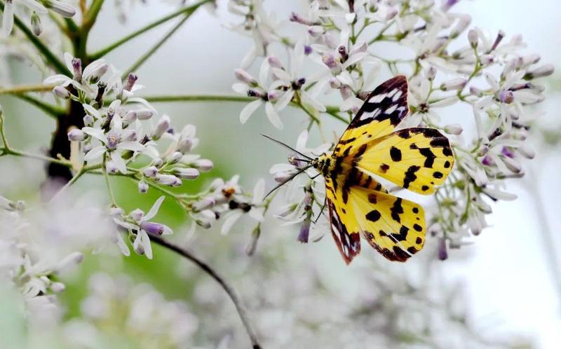 ▲ 采食苦楝花蜜的豹尺蛾。飞蛾也是传粉的能手。