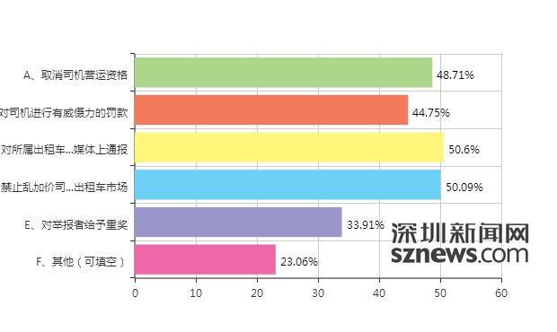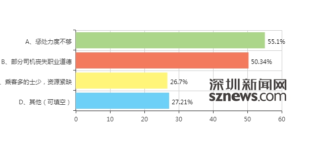 一石激起千层浪。此后,陆续有网友给深圳新闻网记者发来亲身遭遇,证实加价行为并非个案。在深圳新闻网的调查中,65.64%的人表示遭遇过乱加价行为,超五成网友(55.1%)认为原因在于对乱加价的的士司机惩处力度不够。对于这类司机应该如何处理,网友也给出了自己的选择,过半网友支持将违规司机所属的公司在媒体上通报并重罚,将不打表乱加价司机逐出出租车市场。
