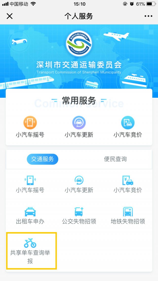 关注并进入「深圳交委」微信公众号;点击「便民服务」菜单栏 &;在「交通服务」分类下就可以找到「共享单车查询举报」功能了!