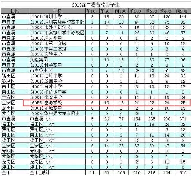 总分前十名中,深圳富源学校占了六人。前五十名,富源学校占了十三人,总分前一百名占了十六人。可是总分前五百名中,富源学校占到的数量却没有超过30人。