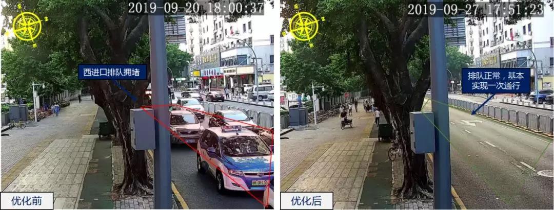 梅华/梅村路口位于梅林片区,周边商业住宅小区密集,早晚高峰通勤需求大。为保障行人过街安全,7月份以来,路口加装了控右箭头信号灯,同时为了解决人车交织问题,增加了行人专用相位,由于相位增多周期上升,相应的右转车辆通行效率会有所降低,导致高峰期出现东行排队较长的情况。
