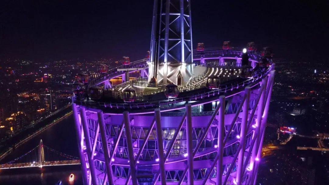 这座摩天轮很不一般,除了最高455米全球最高的高度之外。与一般竖立的摩天轮不同,广州塔摩天轮的观光球舱,不是悬挂在轨道上,而是沿着倾斜的轨道运转。
