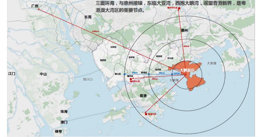 大鹏新区位于深圳都市圈“深惠汕发展轴”的重要节点,与周边区域携手构建科技创新产业体系、共建海洋经济组团、积极参与对外开放,打造世界级滨海生态旅游度假区。