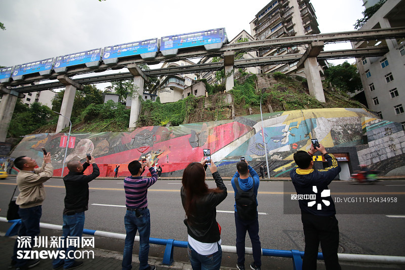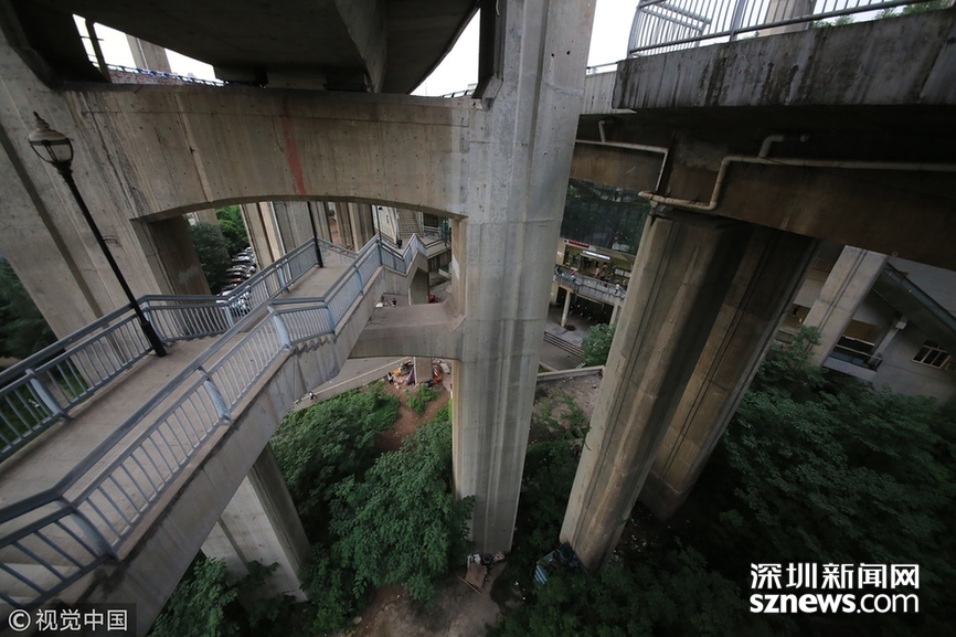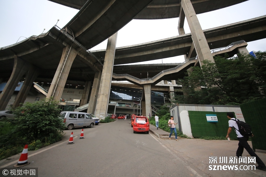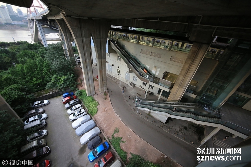 2018年5月29日,重庆,魔幻重庆又双叒叕放大招!还有一个独特的亮点,重庆轨道交通3号线铜元局站,出口由一段长梯衔接上方立交桥和下方的路面,与全国最高城市立交桥苏家坝立交组成了独特风景,许多游客专门赶来拍照。