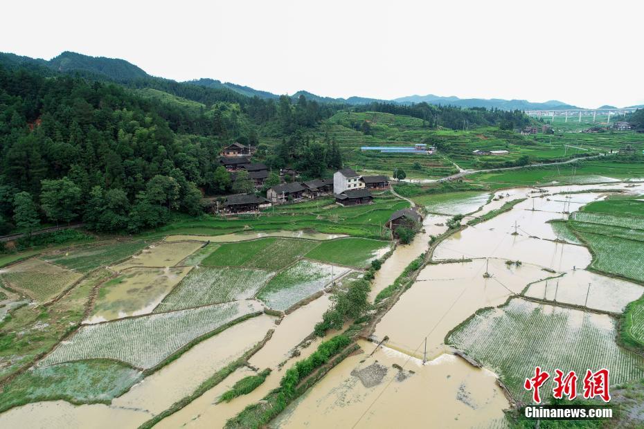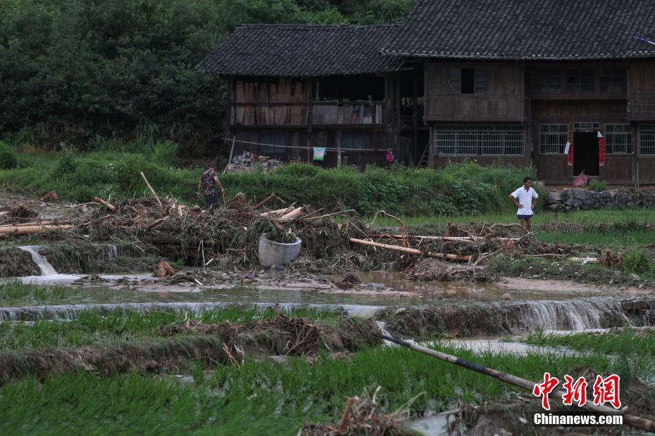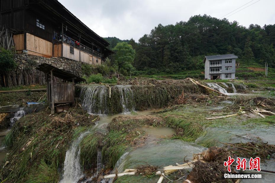 贵州省天柱县高酿镇被洪水冲毁的稻田与房屋。 中新社记者 贺俊怡摄