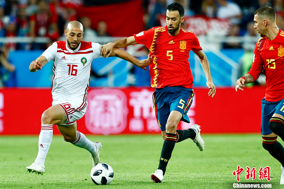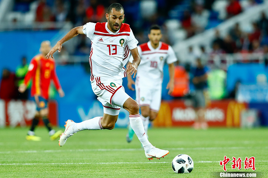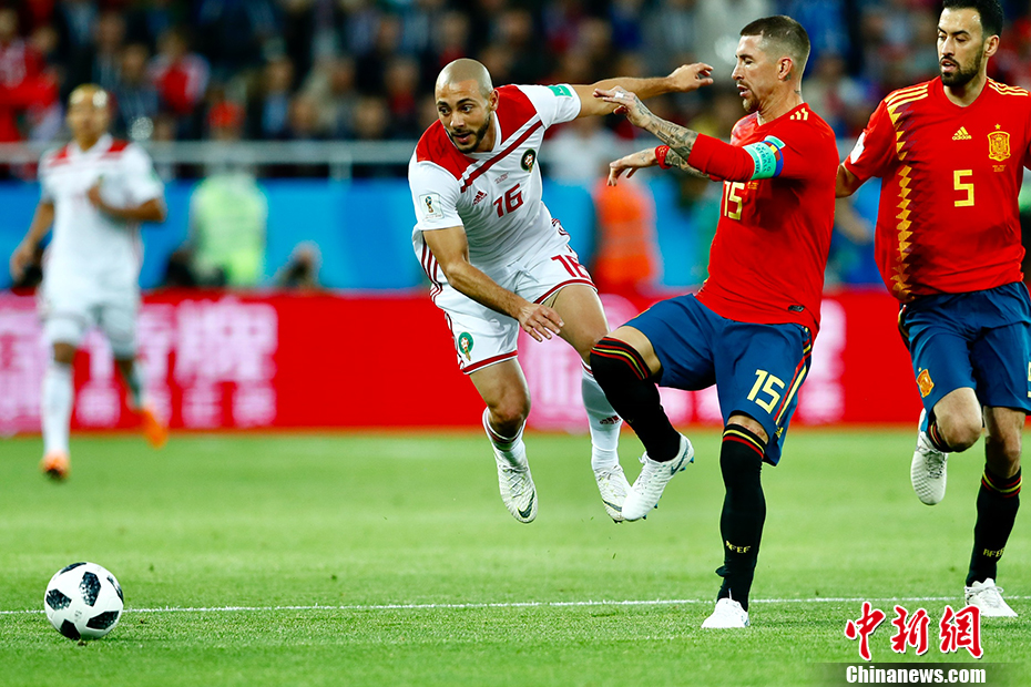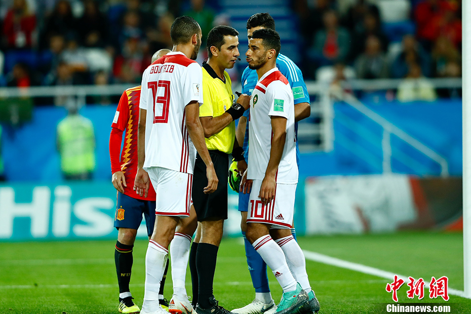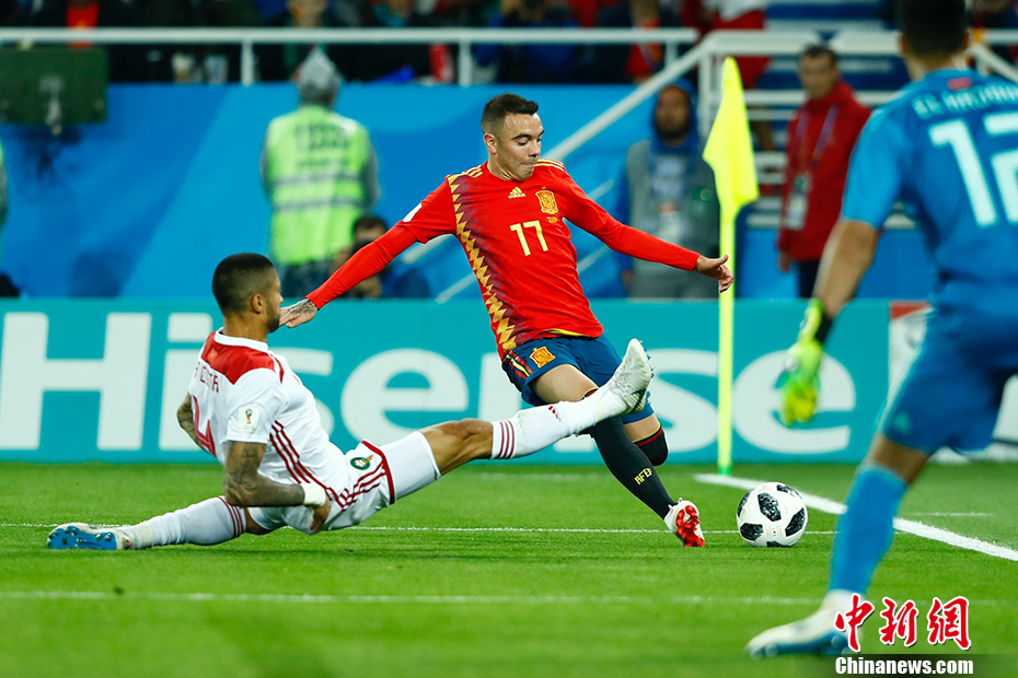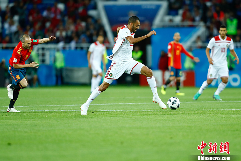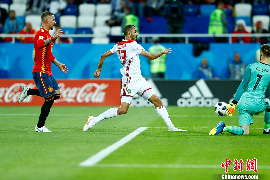 这是两队第一次在世界杯的赛场上交手,但率先打破场上僵局的确是实力略逊一筹的摩洛哥。第14分钟拉莫斯和伊涅斯塔配合出现失误,布塔伊卜拿球后快速突进,面对出击的德赫亚打了一个穿裆破门得分。中新社记者 富田 摄