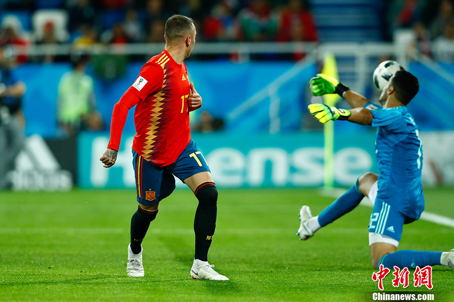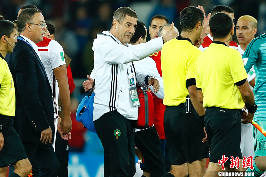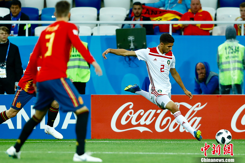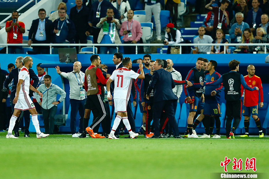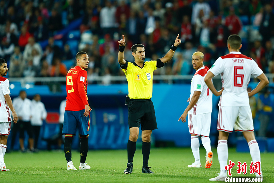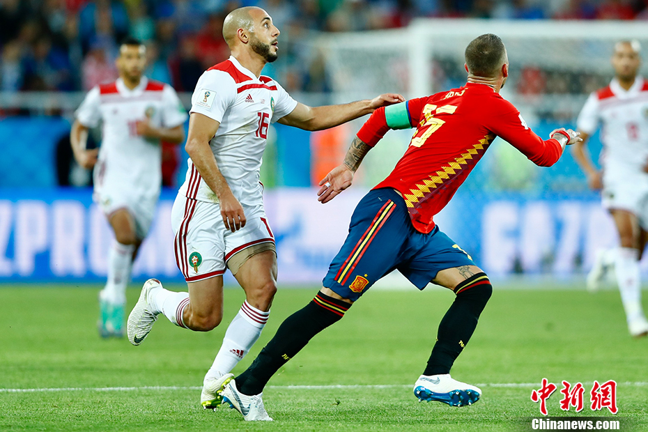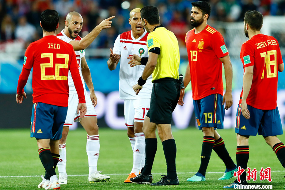 这是两队第一次在世界杯的赛场上交手,但率先打破场上僵局的确是实力略逊一筹的摩洛哥。第14分钟拉莫斯和伊涅斯塔配合出现失误,布塔伊卜拿球后快速突进,面对出击的德赫亚打了一个穿裆破门得分。中新社记者 富田 摄