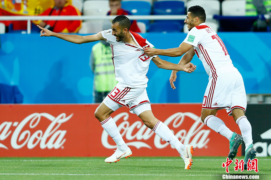 这是两队第一次在世界杯的赛场上交手,但率先打破场上僵局的确是实力略逊一筹的摩洛哥。第14分钟拉莫斯和伊涅斯塔配合出现失误,布塔伊卜拿球后快速突进,面对出击的德赫亚打了一个穿裆破门得分。图为摩洛哥队庆祝进球。中新社记者 富田 摄