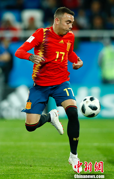 比分落后的西班牙随即展开大举进攻,并由阿斯帕斯在补时阶段攻入一球。图为阿斯帕斯后脚跟将球打入球门。 中新社记者 富田摄