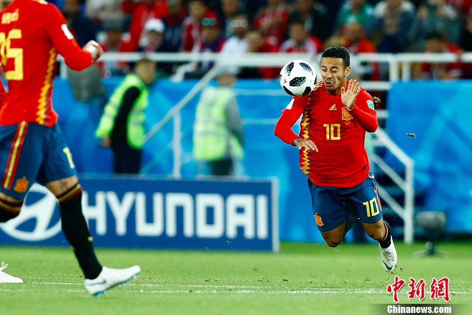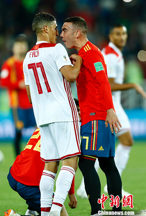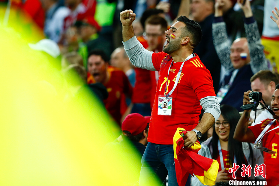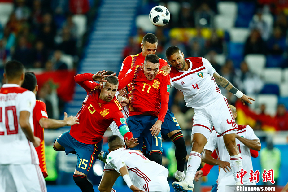 北京时间6月26日凌晨,俄罗斯世界杯B组小组赛打响收官之战,西班牙面对已经提前出局的摩洛哥并没能讨得什么便宜,两度在落后的情况下两度扳平,最终2-2与对手握手言和。西班牙1胜2平,凭借进球优势力压葡萄牙,以小组第一的身份出线。中新社记者 富田 摄