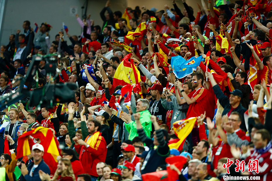北京时间6月26日凌晨,俄罗斯世界杯B组小组赛打响收官之战,西班牙面对已经提前出局的摩洛哥并没能讨得什么便宜,两度在落后的情况下两度扳平,最终2-2与对手握手言和。西班牙1胜2平,凭借进球优势力压葡萄牙,以小组第一的身份出线。图为看台上的西班牙球迷。中新社记者 富田 摄