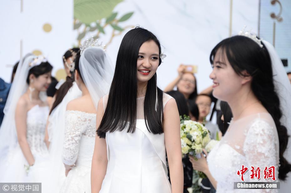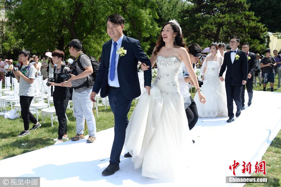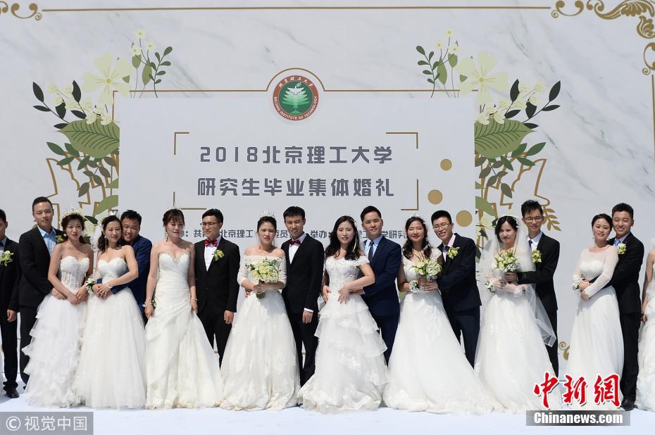 2018年6月10日,北京理工大学第二届研究生毕业集体婚礼在北理工中心花园举行。此次集体婚礼共有18对新人参加,现场座无虚席。图片来源:视觉中国
