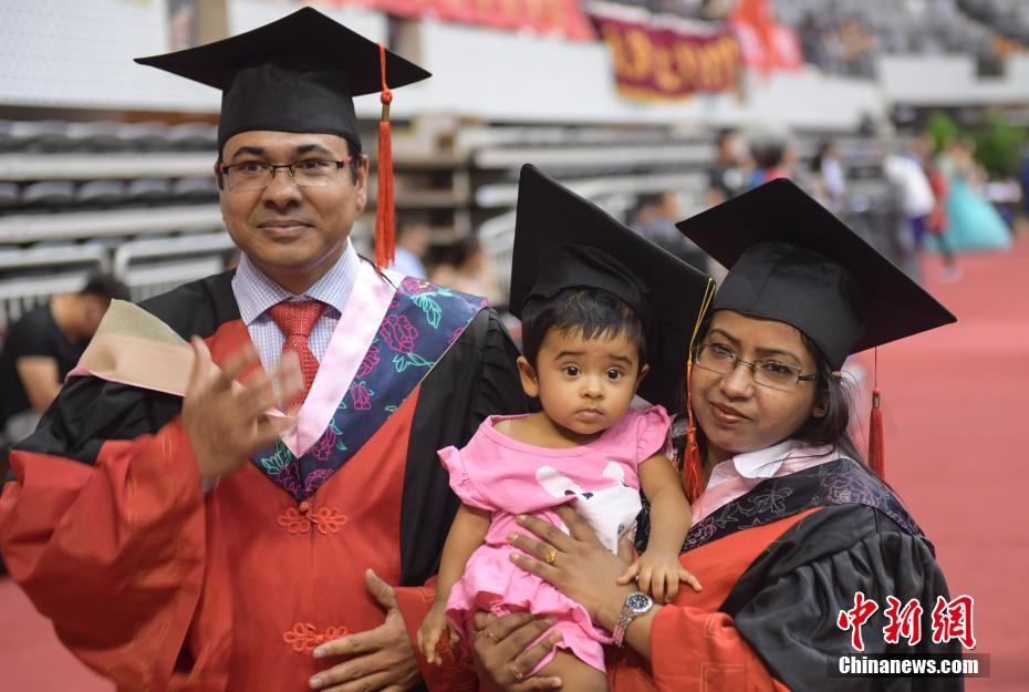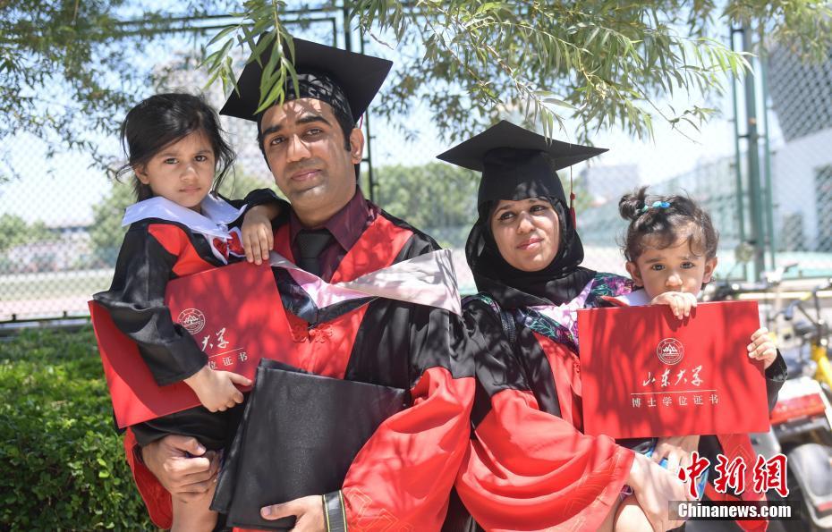 6月23日,外国博士留学生夫妇同时毕业,一家人拍合影纪念。当日,山东大学2018年毕业典礼暨学位授予仪式在济南举行,多对博士夫妇携带子女同场庆祝毕业。中新社记者 张勇 摄