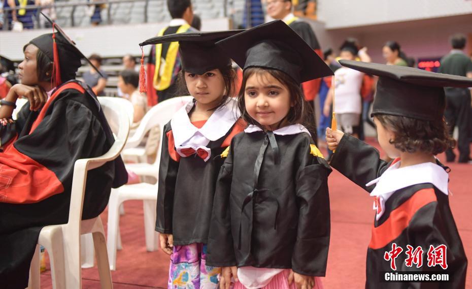 6月23日,“小博士”在拍照合影。当日,山东大学2018年毕业典礼暨学位授予仪式在济南举行,多对博士夫妇携带子女同场庆祝毕业。中新社记者 张勇 摄