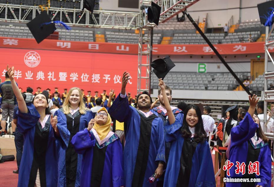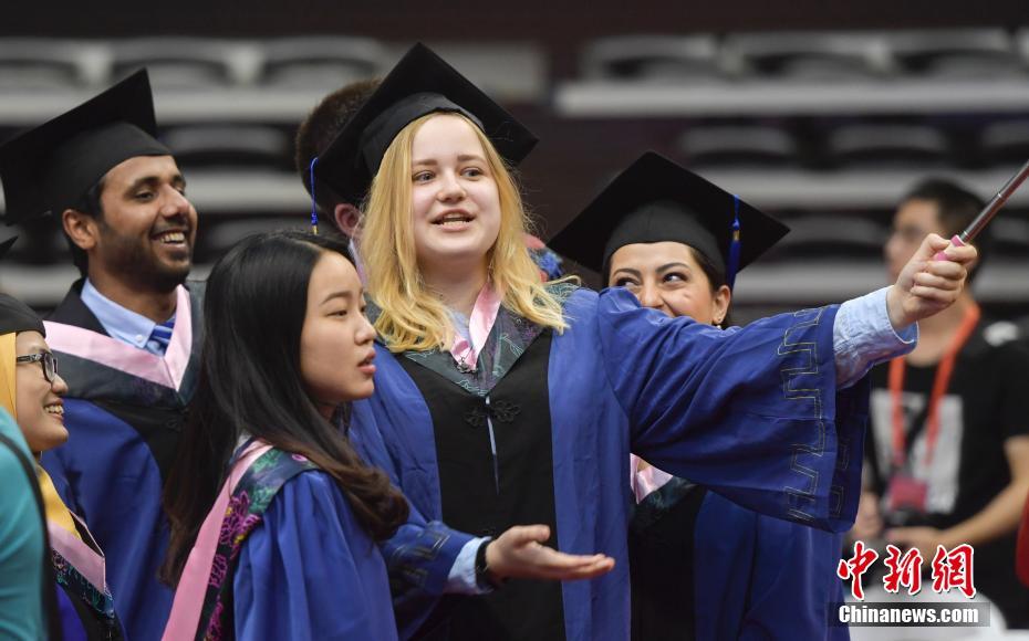 6月23日,山东大学2018年毕业典礼暨学位授予仪式在济南举行,外国留学生拍创意毕业照庆祝毕业。 中新社记者 张勇摄
