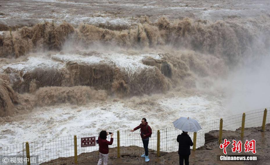 2018年3月17日,山西临汾,游客在吉县黄河壶口瀑布欣赏“桃花汛”。受上游融冰开河影响,山西吉县黄河壶口瀑布迎来“桃花汛”。壶口瀑布水量骤增,每秒流量达到2440立方米,形成壮美瀑布群。“桃花汛”是指每年三月下旬到四月上旬,黄河内蒙古段冰凌消融形成春汛。当其流至下游时,由于恰逢沿岸山桃花盛开,故被称为“桃花汛”。图片来源:视觉中国