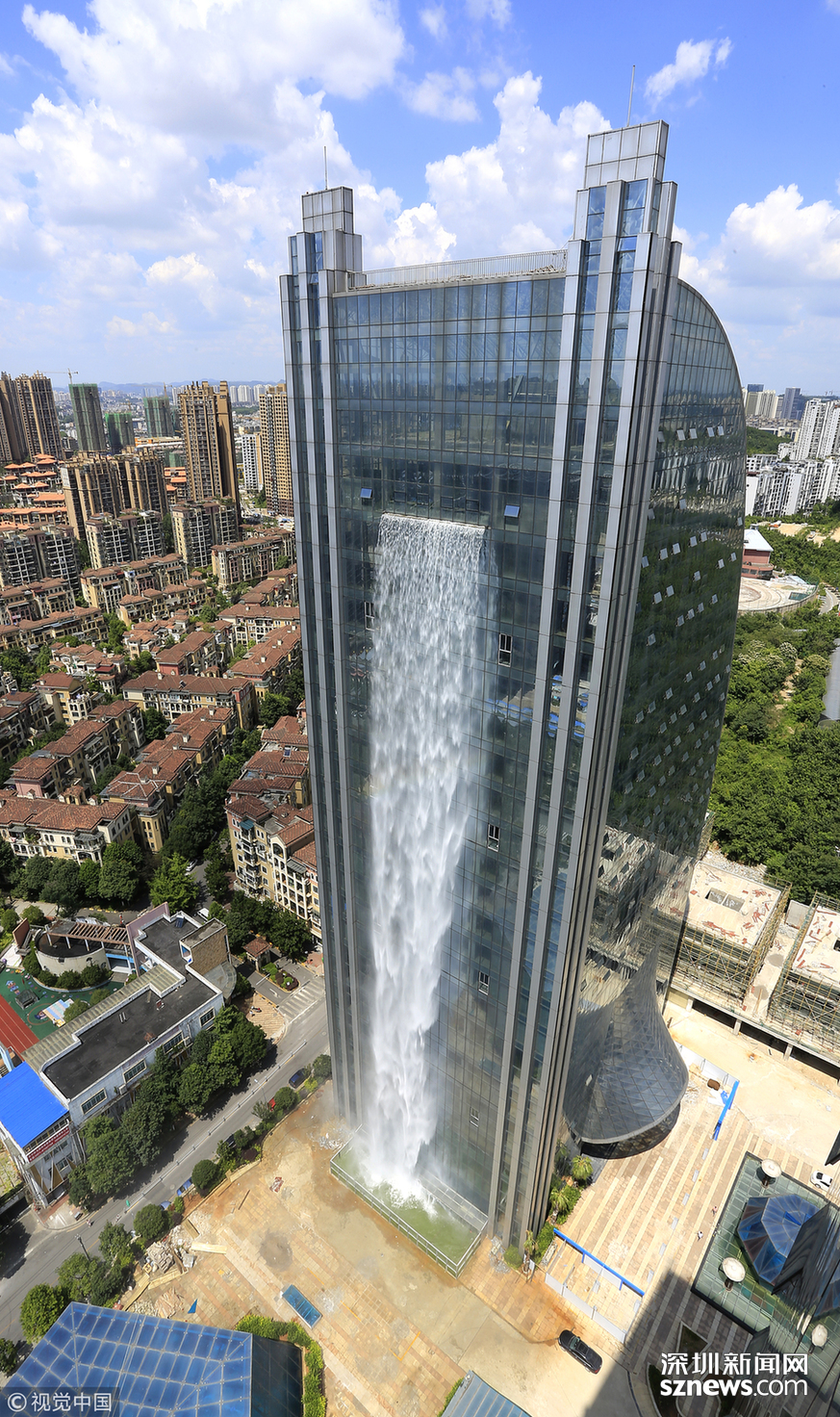 喷水的大楼是烈变大厦,远远望去,大厦像是悬挂一片白练,足足有100多米高,走进一看,原来是真的瀑布。