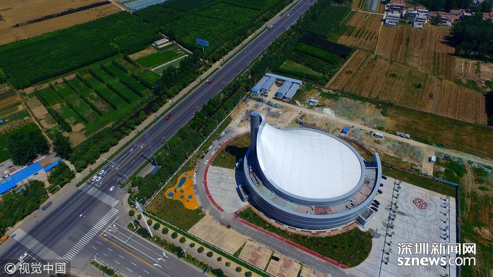2018年6月13日,航拍河南淮阳一座即将竣工落成的体育场馆建筑,市民称酷似一个石磨盘。