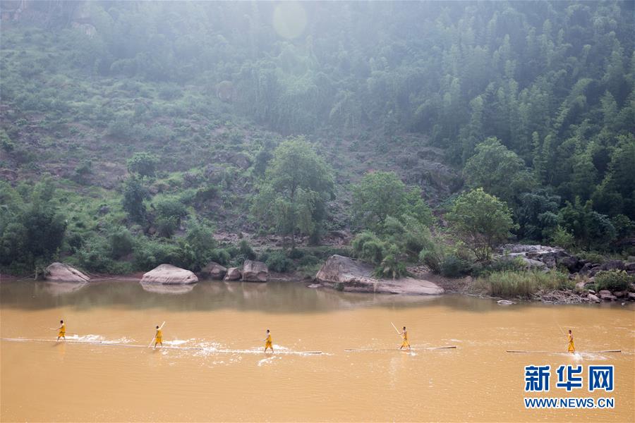 7月24日,赤水市大同古镇的“独竹漂”队员们在赤水河上表演。 “赤水独竹漂”作为贵州省级非物质文化遗产,现已成为当地旅游业的招牌表演项目。表演中,“独竹漂”高手们脚踩楠竹,漂行水上,如履平地。新华社记者 金立旺 摄