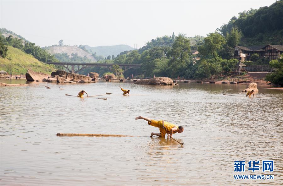 7月24日,赤水市大同古镇的“独竹漂”队员们在赤水河上表演。 “赤水独竹漂”作为贵州省级非物质文化遗产,现已成为当地旅游业的招牌表演项目。表演中,“独竹漂”高手们脚踩楠竹,漂行水上,如履平地。新华社记者 金立旺 摄