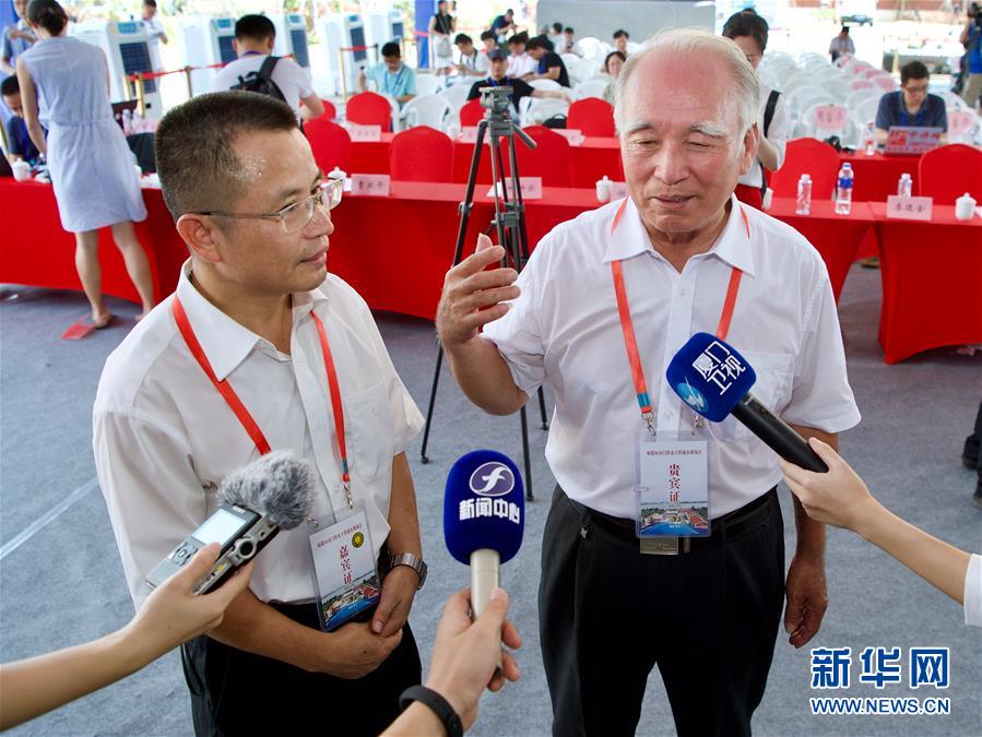 8月5日,在福建晋江举行的福建向金门供水工程通水现场会上,来自金门的王再生老人(右)和福建省水投集团公司副总经理朱金良(左)接受采访。当日上午,福建向金门供水工程通水现场会在福建晋江举行。与此同时,金门当地也举行通水见证仪式。