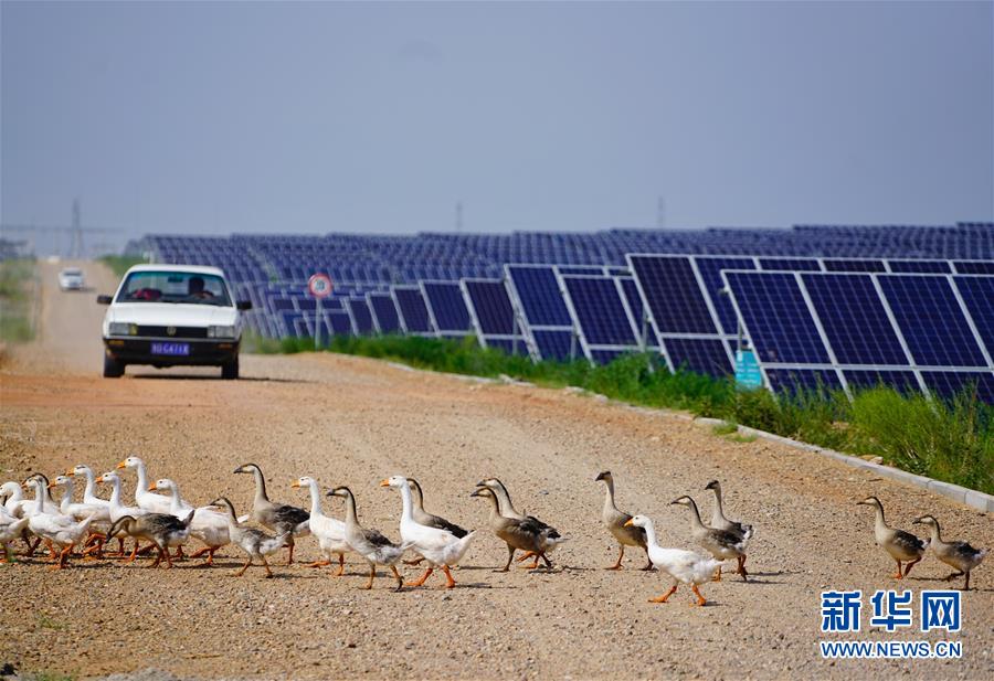 这是内蒙古鄂尔多斯市杭锦旗库布其沙漠生态太阳能光伏光热治沙发电综合示范地(8月1日摄)。“板上发电、板下种草、板间养殖”,目前该太阳能发电项目治沙面积达到了13.3平方公里,每年发电5亿千瓦时,实现销售收入4.5亿元。其社会效益、生态效益、民生效益、经济效益十分显著。