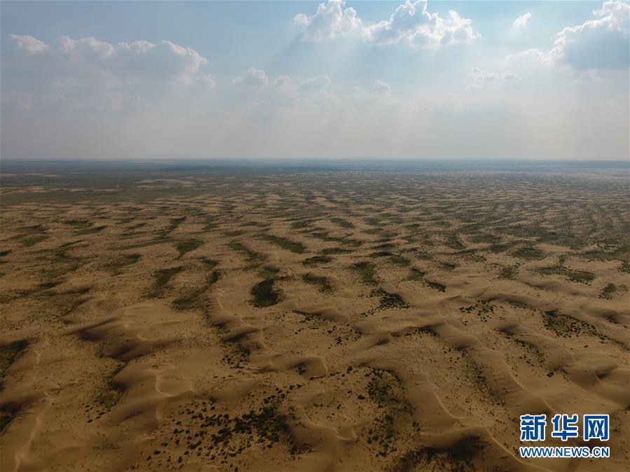 库布其沙漠深处,植被与沙漠形成美丽的纹理(7月31日无人机拍摄)。新华社记者刘磊摄