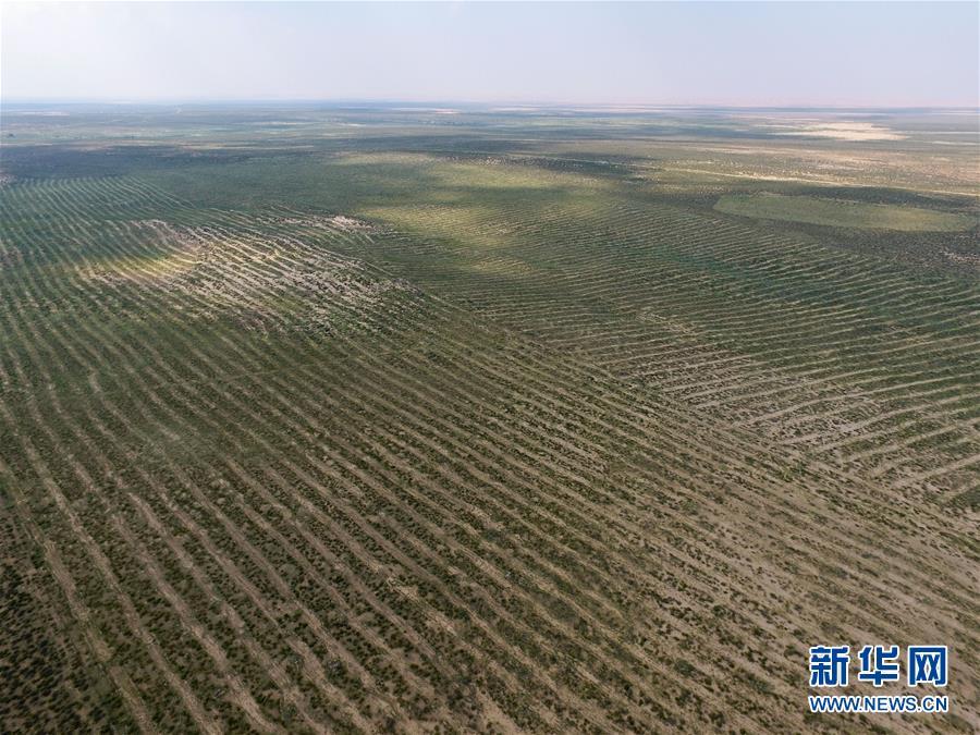 内蒙古杭锦旗沙日召嘎查牧民白音道尔计种植的甘草等沙生植物(7月31日无人机拍摄)。 新华社记者刘磊摄