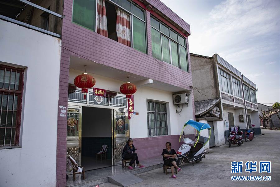 一名堰河村老人在新入住的民居的回廊休息(5月13日摄)。