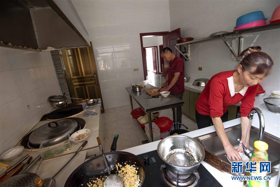堰河村一对夫妻在自家新民居的厨房里忙活(5月12日摄)。