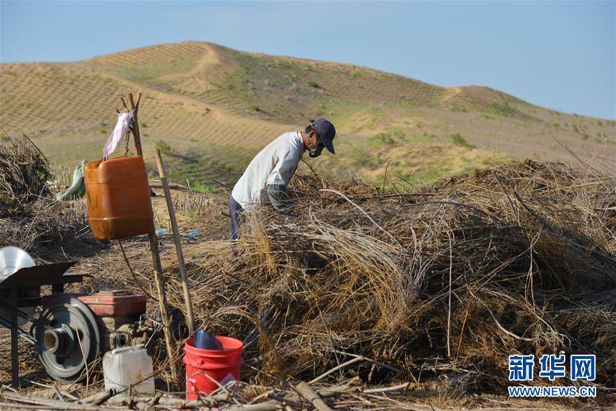 在库布其沙漠中的白土梁林场沙棘林内,林场管理员邓胜利展示沙棘树剪枝育苗技术(8月1日摄)。当地通过种植沙棘,既解决了荒漠化问题,又帮助农牧民增收,实现了生态和经济双重效益。