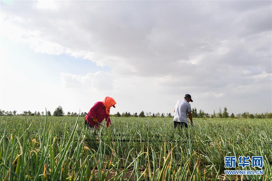 工人在内蒙古鄂尔多斯市杭锦旗阿木古龙产业园区为蔬菜除草(8月1日摄)。该地示范发展沙漠节水现代农业,增加了农牧民收入。