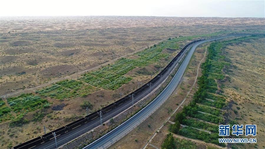 包兰铁路在宁夏中卫市境内穿越沙海(6月26日无人机拍摄)。 新华社记者 王鹏 摄
