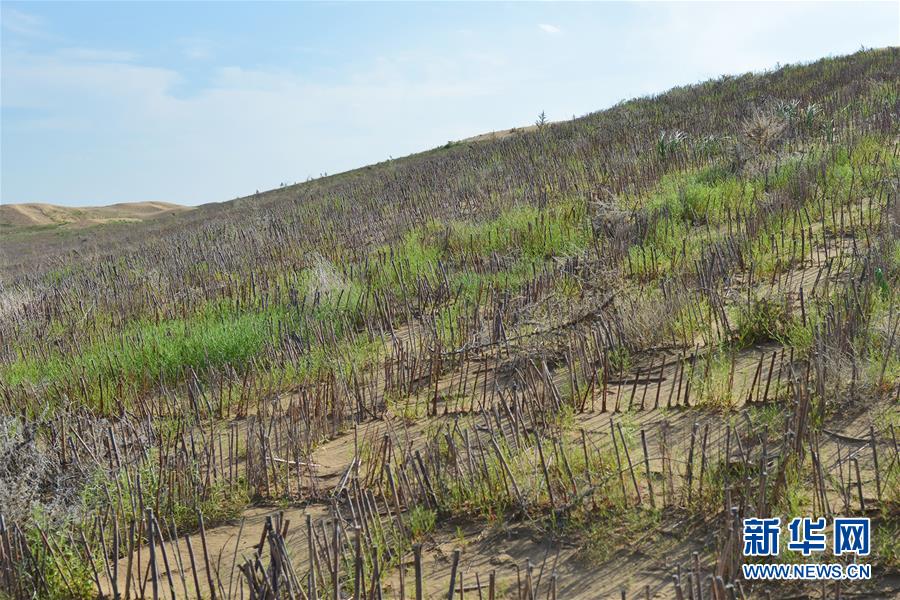 库布其沙漠中的人工沙障(8月2日无人机拍摄)。 新华社记者刘磊摄