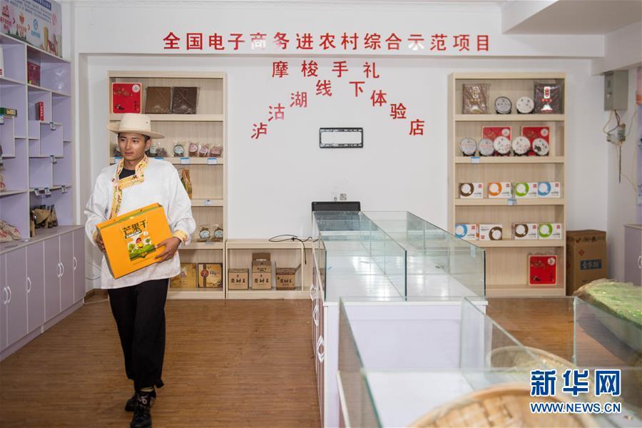 摩梭青年次里打史在宁蒗永宁乡落水村的电子商务体验店里整理商品(7月31日摄)。 新华社记者 胡超 摄