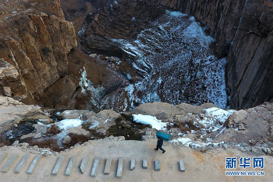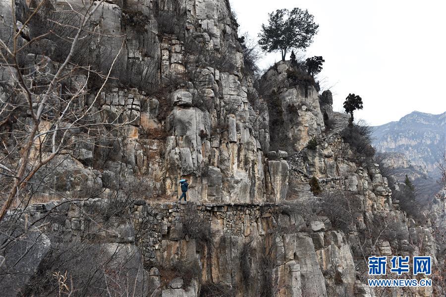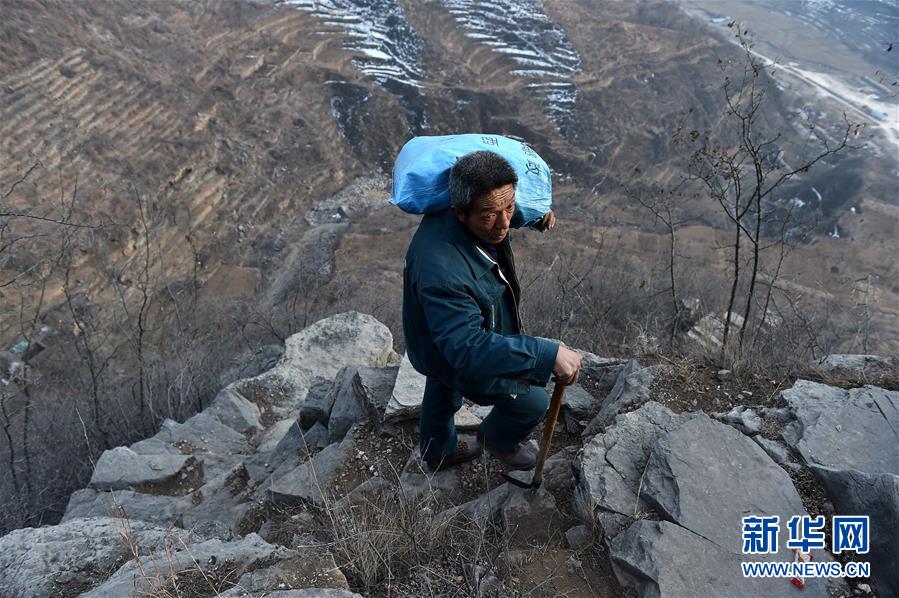 1月17日,杨银科背着沉重的邮包在太行山崎岖的山路上行走。新华社记者 詹彦摄